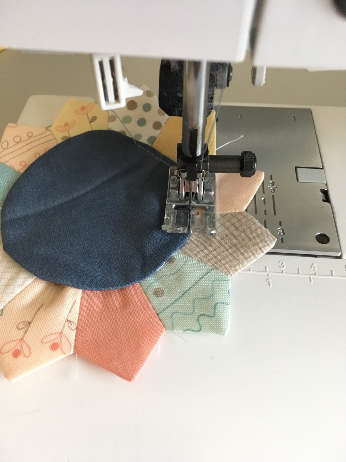 Next, you can apply the circle to the dresden plate. You can either appliqué it on by hand or sew with your machine. I chose to sew with the machine.