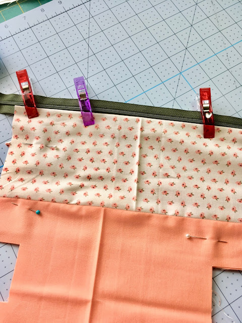 Place zipper along the edge and sew in place. My zipper was longer than the bag. I like to sew in on then cut to correct size.